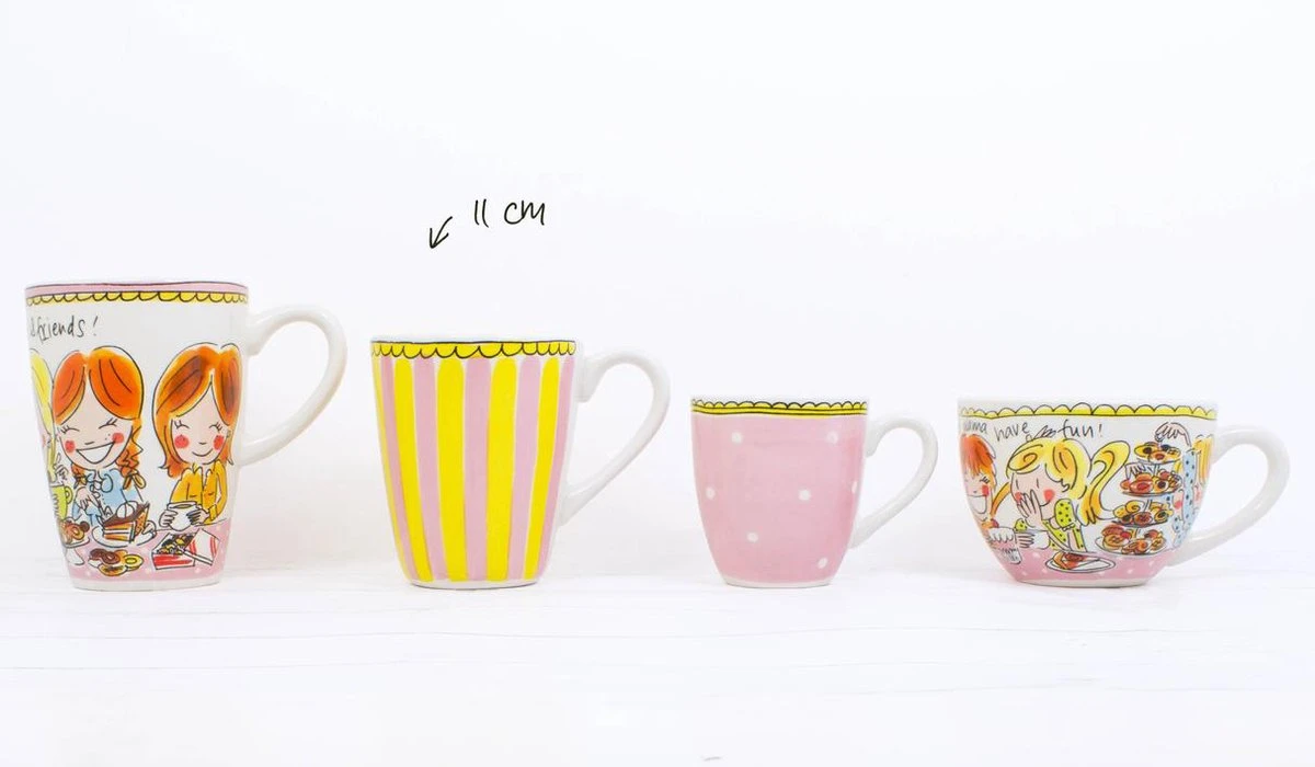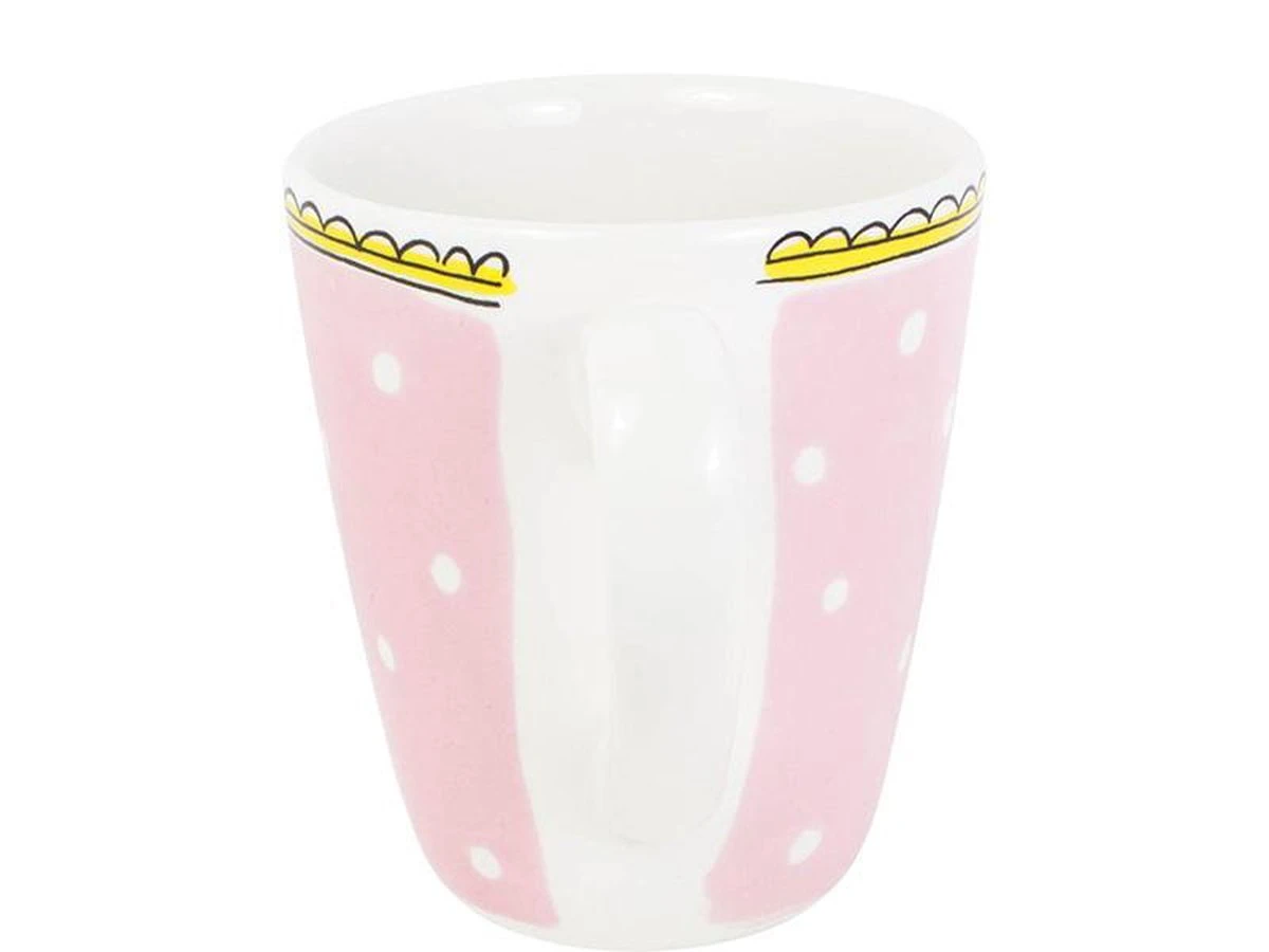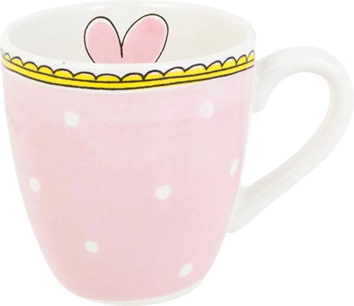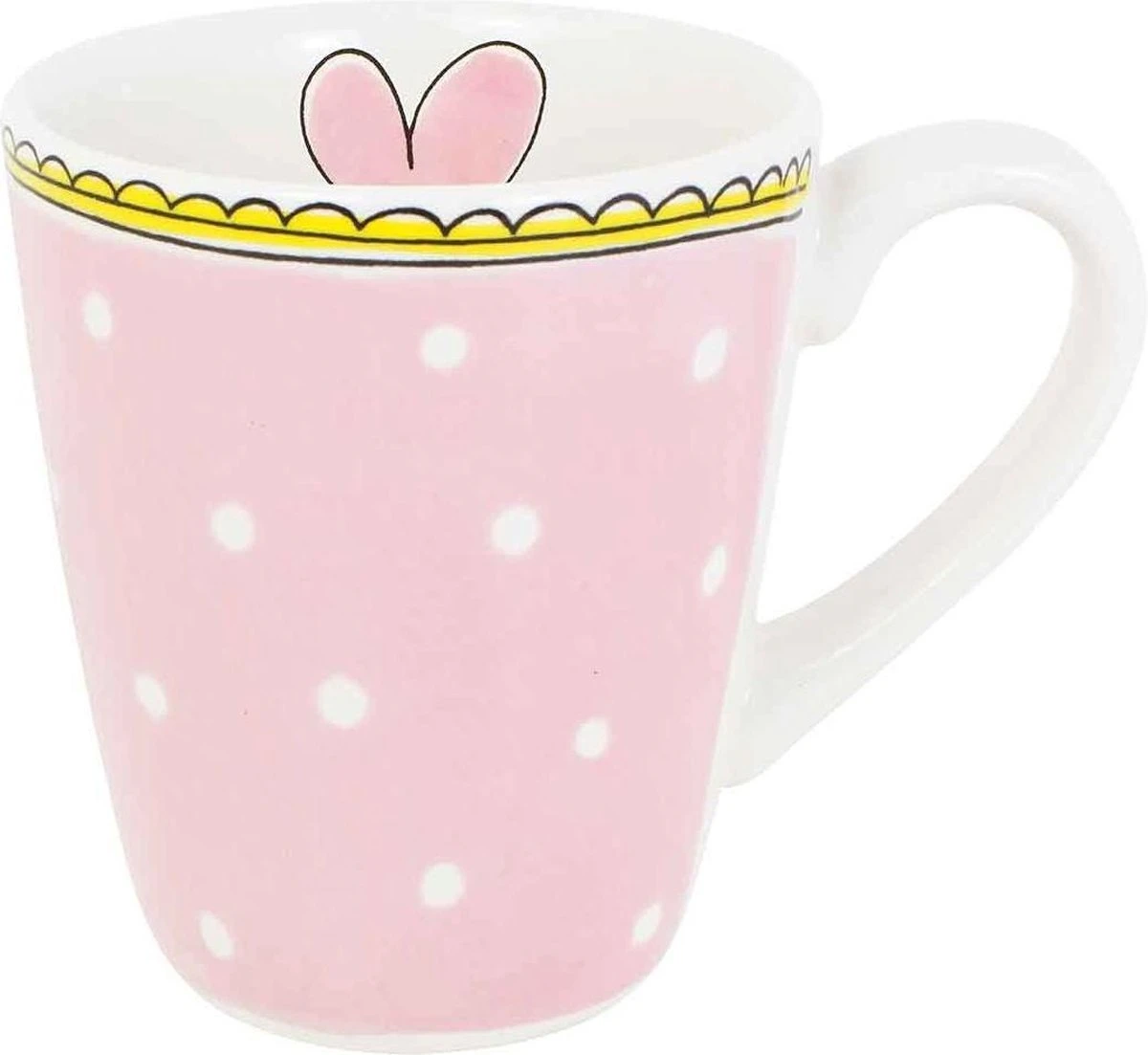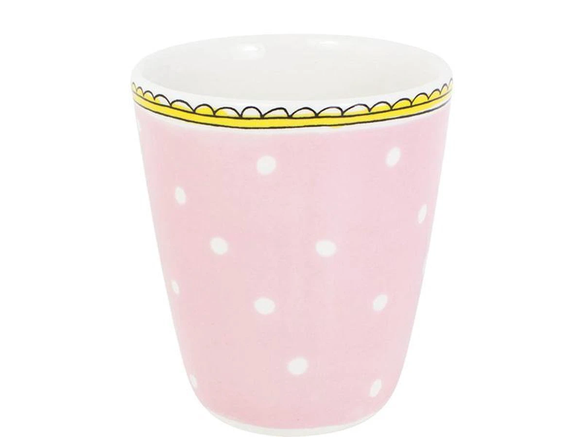 Een fijne licht roze beker met witte stipjes en een gele bovenrand. In de beker staat een roze hart afgebeeld. De beker Stip behoort tot de vernieuwde collectie Even Bijkletsen van Blond Amsterdam.