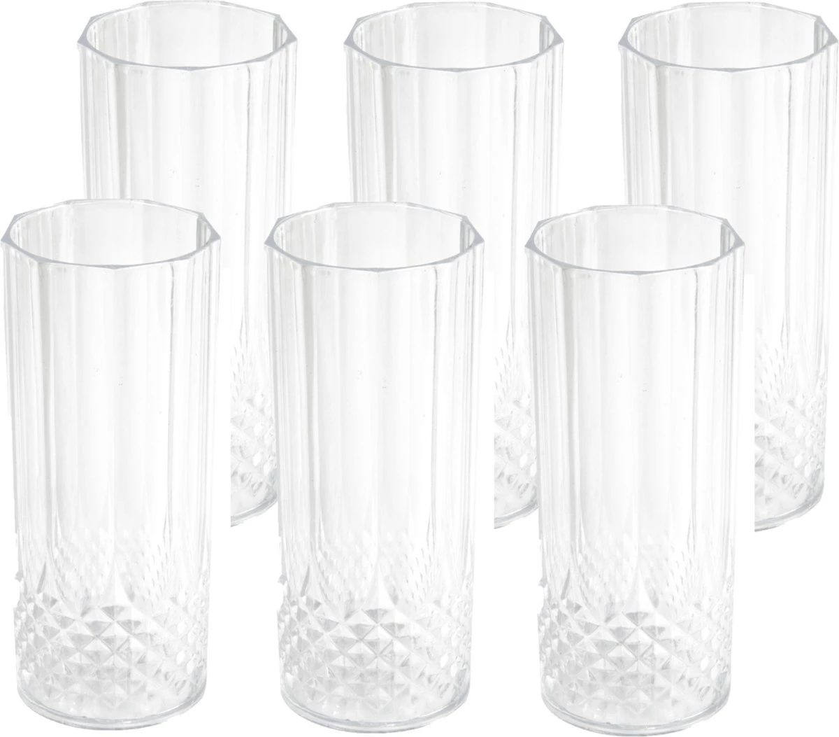 6x stuks herbruikbare kunststof longdrinkglazen 400 ml. Set herbruikbare longdrinkglazen met kristaleffect. Ideaal voor op de camping, tijdens een picknick/barbecue of een feestje! Geschikt voor in de vaatwasser. Inhoud: ongeveer 400 ml. Afmetingen per stuk: ongeveer 6,5 x 15,5 cm.