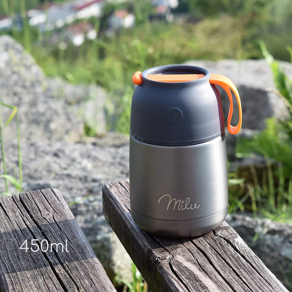 - Milu warmtehouder met 450 ml inhoud van hoogwaardig roestvrij staal met dubbelwandige isolatie en anti-slip basis.